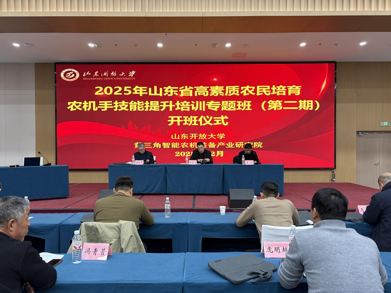 12月11日,为加速培育现代农业发展亟需的高素质农机手队伍,推动农业机械化向高质量、智能化迈进,2025 年山东省高素质农民培育农机手技能提升培训专题班(第二期)在我校高新校区正式开班。山东省农业机械安全监理站副站长张永飞出席开班仪式并讲授开班第一课,黄三角智能农机装备产业研究院副院长李政平出席仪式,山东开放大学培训部主任董峰主持仪式。
