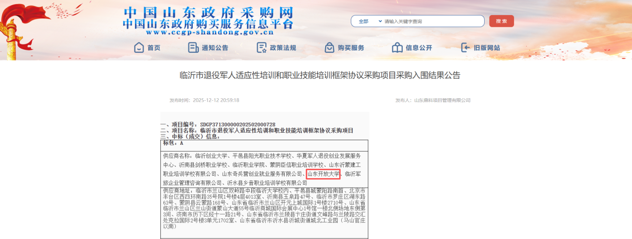 近日,我校成功入围临沂市退役军人适应性培训和职业技能培训框架协议采购项目。